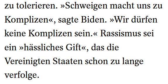 Die Tagesschau zitiert den amerikanischen Präsidenten, der Rassismus scharf verurteile. Von Frauenhass spricht er mit keinem Wort. Seine Lösung: „Wir müssen unsere Herzen wandeln.“ Das Patriarchat, toxische Männlichkeit, misogyne und rassistische Gewalt wird mit derartigen Plattitüden jedoch nicht verschwinden.
