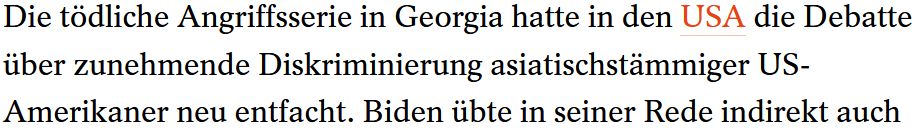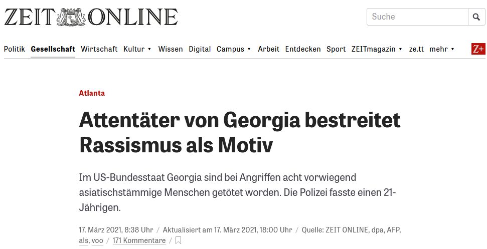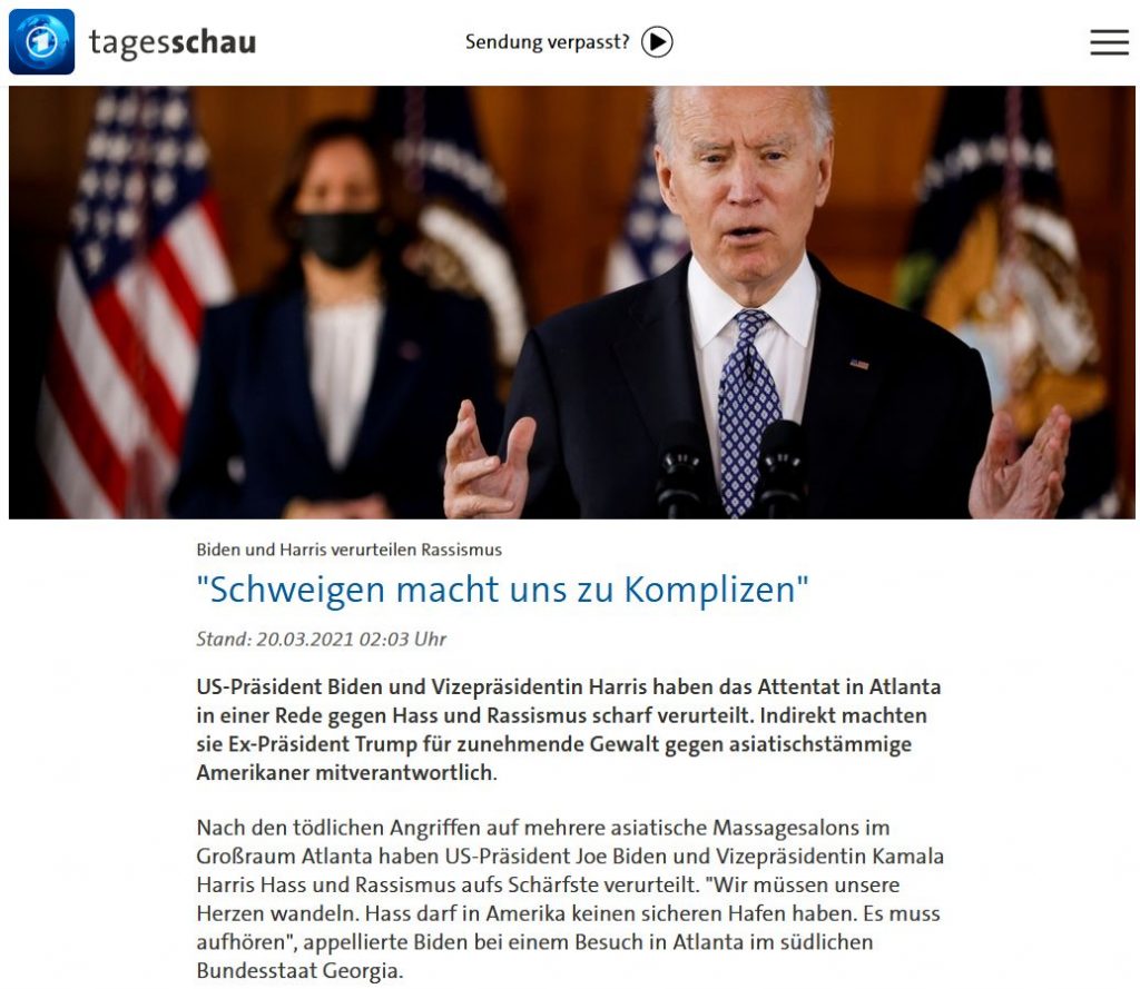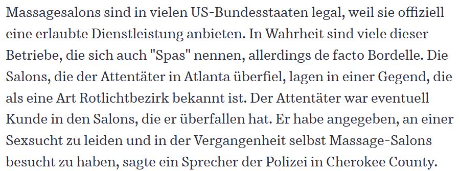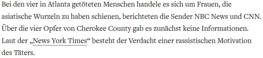 Darüber hinaus wird in der deutschen Berichterstattung fortlaufend von „asiatisch-stämmigen Amerikanern“ gesprochen. Sprachlich werden die Opfer auch auf diese Weise unsichtbar gemacht, denn es handelt sich vor allem um Amerikanerinnen: