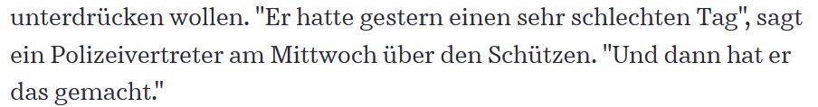 Völlig fassungslos macht die Aussage eines Polizeivertreters, dass der Täter aufgrund eines „sehr schlechten Tages“ sieben Frauen und einen Mann ermordet hat: