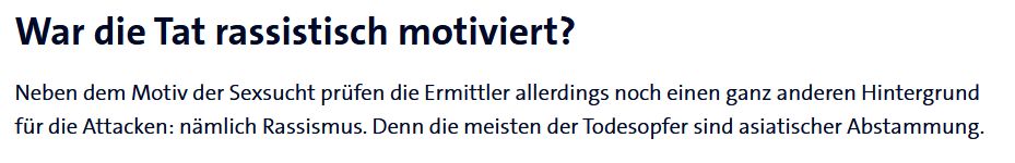 Die Aussage der Süddeutschen Zeitung ignoriert ebenfalls das Motiv des Frauenhasses, obwohl sie sogar sechs der sieben getöteten Frauen nennt, jedoch ausschließlich den Teilaspekt Rassismus im Fokus hat: